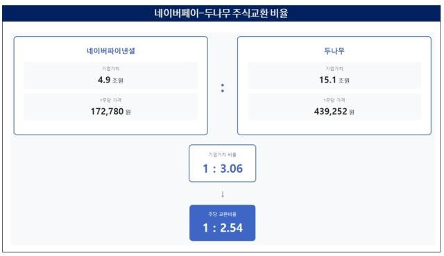 즉, 기업가치는 두나무가 네이버파이낸셜보다 약 세 배 이상 높게 평가되었으나 주당 가치 차이로 인해 교환 비율이 조정된 것입니다.