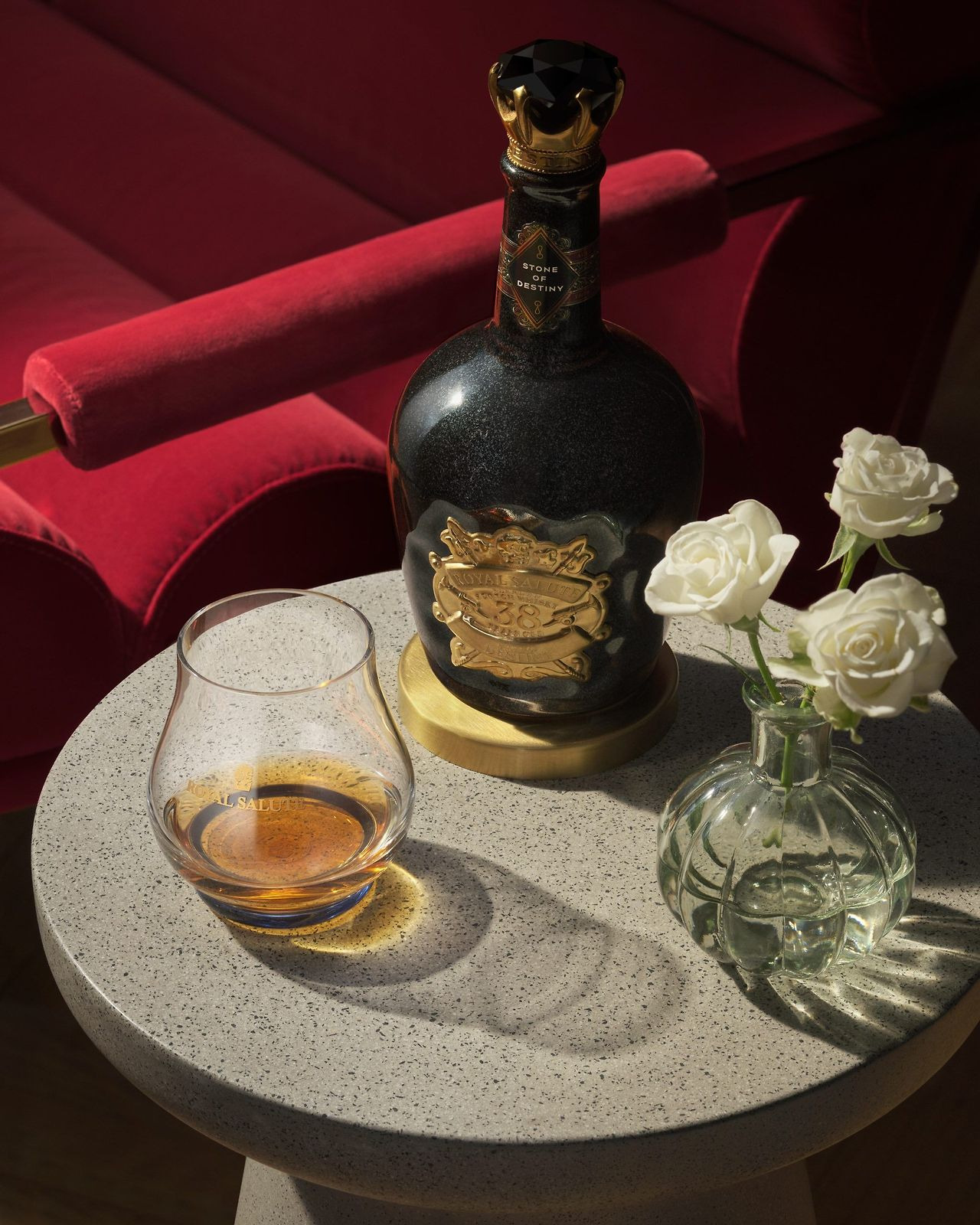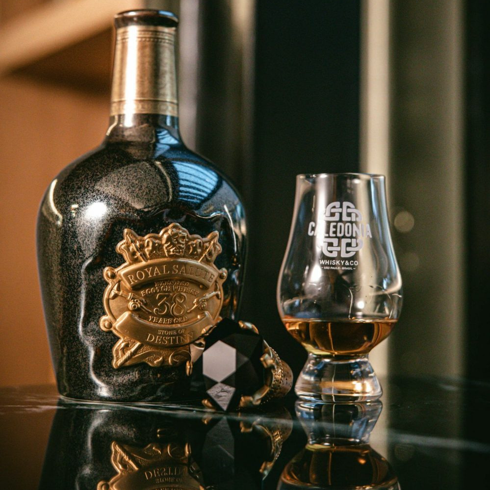 로얄 살루트 38년산은 ‘스톤 오브 데스티니(Stone of Destiny)’ 시리즈로도 잘 알려져 있습니다. 스코틀랜드 왕들의 대관식 때 사용되던 전설의 돌에서 영감을 받아 제작되었으며, 병 디자인도 중세 유럽 왕실의 상징물과 건축양식을 형상화하고 있습니다. 이 제품은 단순한 주류가 아닌, 하나의 예술 작품으로 평가받습니다.
