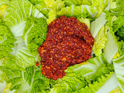 • 1단계: 물기 뺀 봄동에 고춧가루 일부를 먼저 뿌려 색 입히기