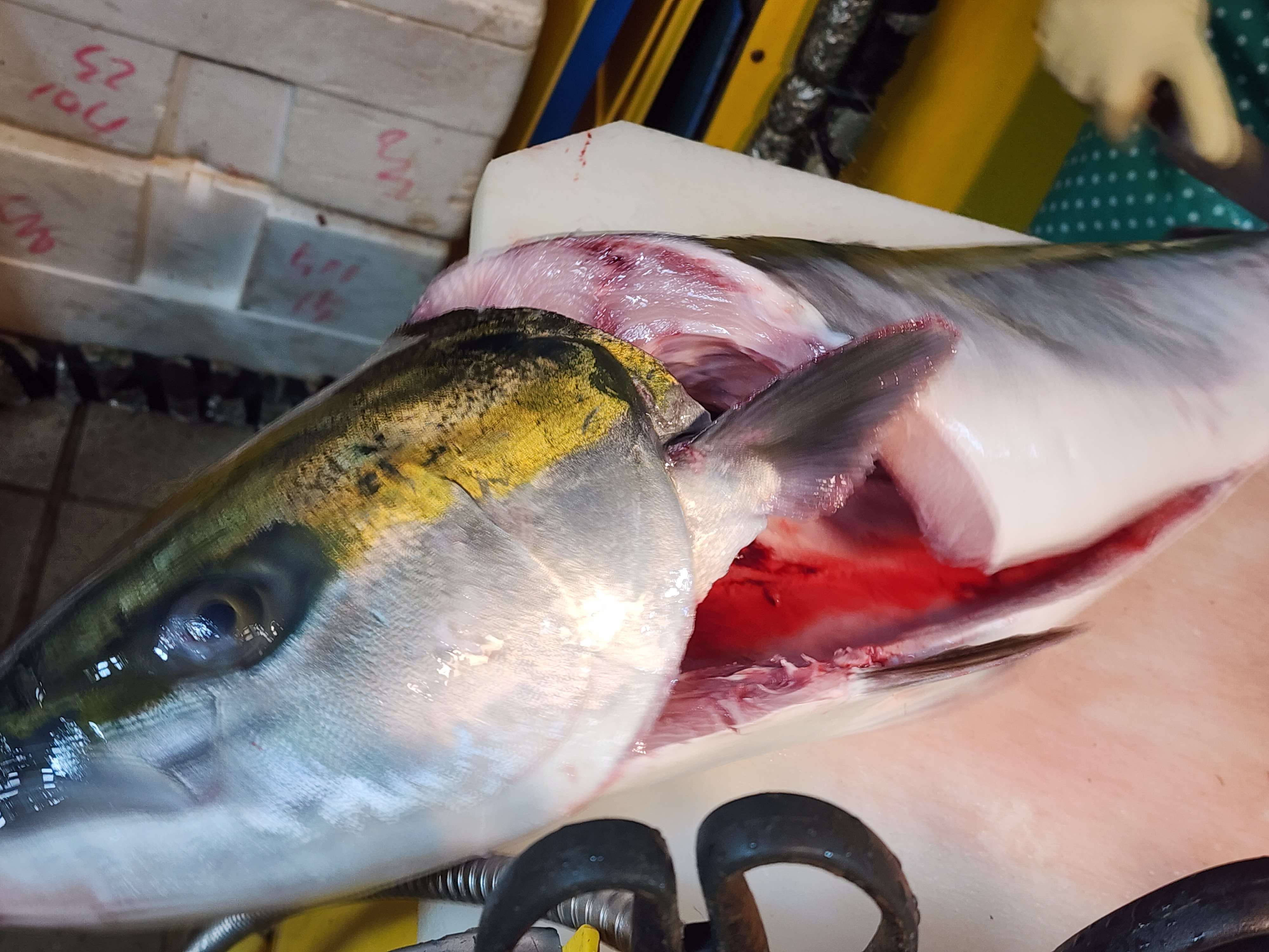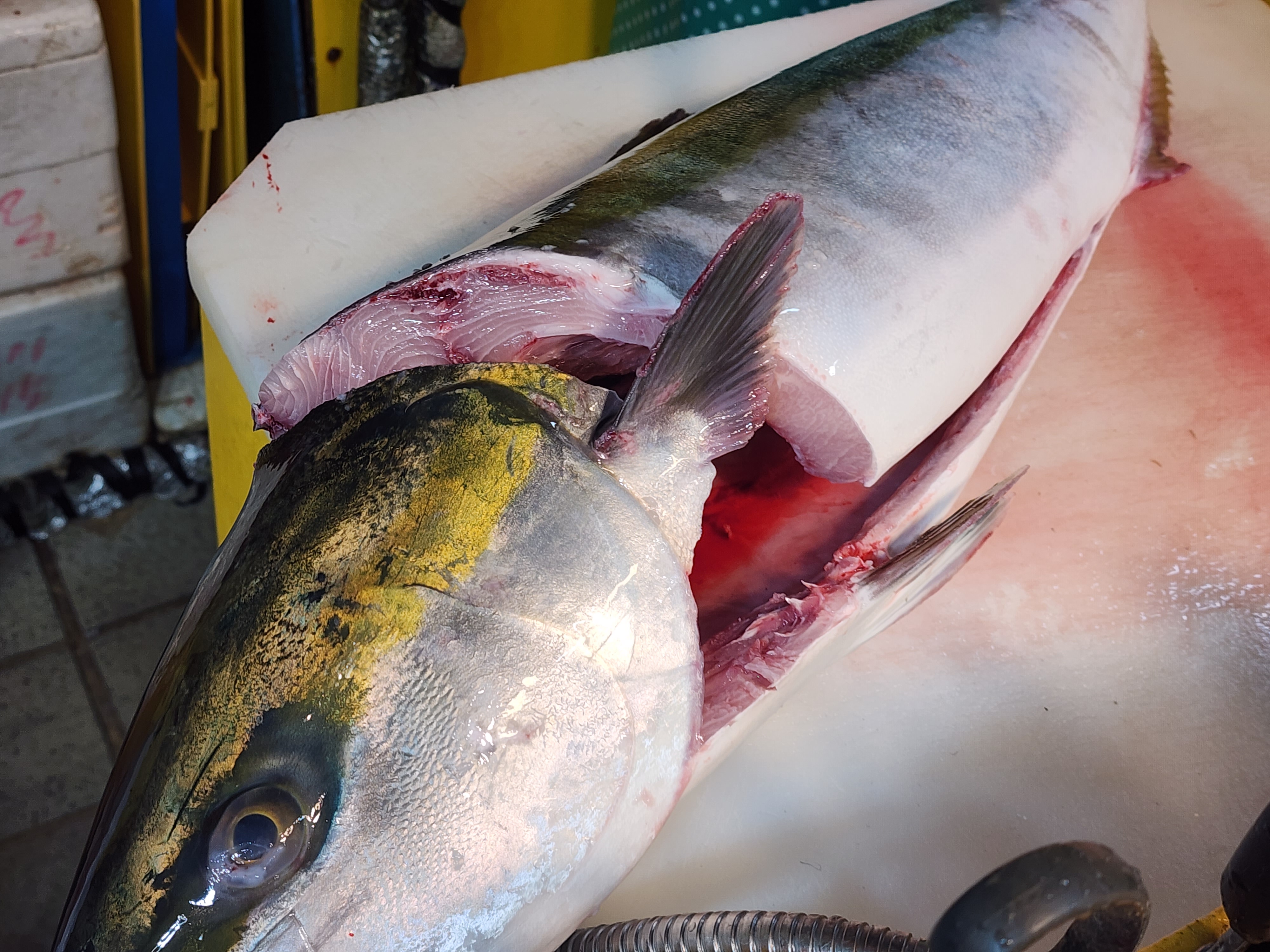 • 지느러미 기준으로는, 가슴지느러미와 배지느러미의 끝선 위치가 유의미합니다. 방어는 이 둘의 끝선이 거의 일치하는 편이고, 부시리는 배지느러미가 가슴지느러미보다 뒤쪽에 있어 끝선이 어긋나는 경우가 많습니다.