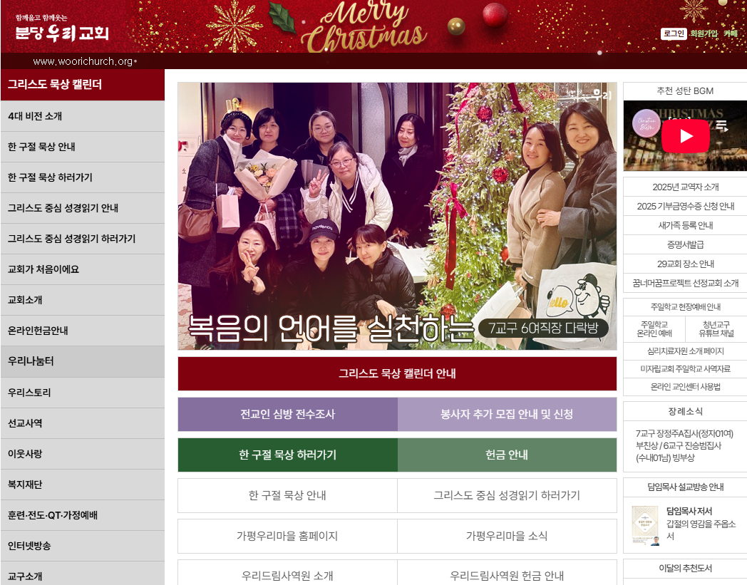 분당우리교회 공식 홈페이지는 교회 소개, 예배 안내, 사역 비전, 성도 참여 프로그램 등을 한눈에 확인할 수 있도록 구성되어 있습니다. 온라인 예배와 가정 예배 자료, 각 부서별 소식까지 비교적 체계적으로 정리되어 있어 교회 내부 구성원뿐 아니라 외부 방문자에게도 정보 접근성이 높은 편입니다.
