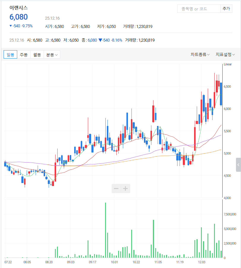 이랜시스 주가는 장기 우상향보다는 테마에 따른 단기 급등락이 반복되는 형태를 보여 왔습니다. 특히 로봇, 스마트팩토리, 자동화 설비, 삼성 투자 확대와 같은 키워드가 부각될 때 거래량이 급증하며 단기간에 주가가 크게 움직이는 경향이 있습니다.