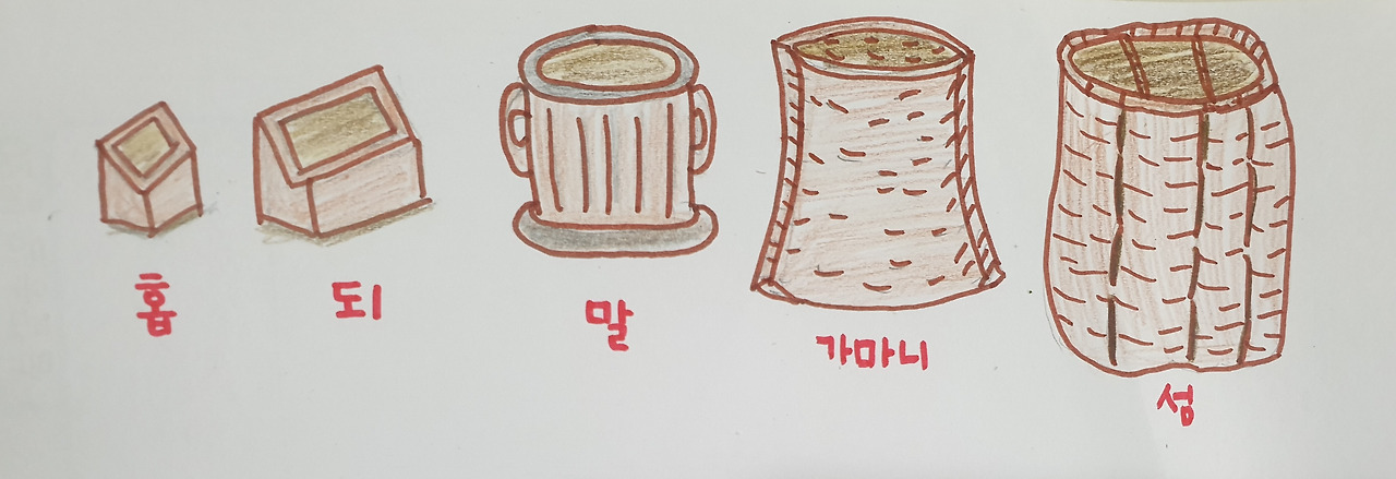 ‘말’은 전통적으로 부피 단위이며 1말은 약 18리터를 의미합니다. 따라서 무게는 내용물의 밀도에 따라 달라질 수밖에 없습니다. 같은 1말이라도 쌀, 콩, 참깨, 들깨 모두 무게가 다르게 나타나는 이유가 바로 여기에 있습니다.