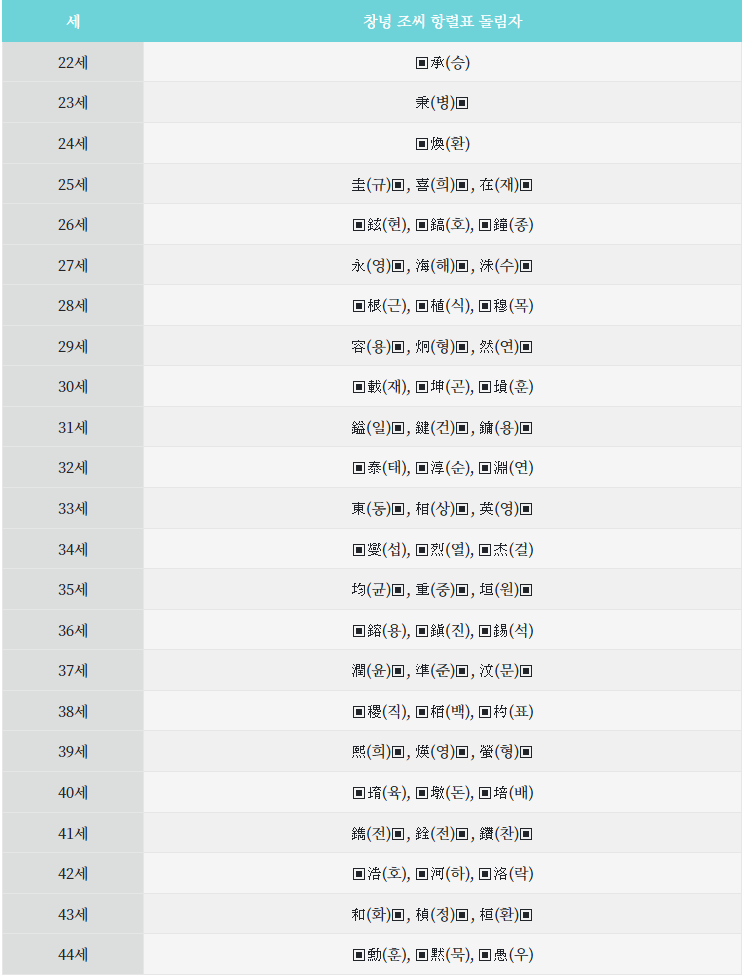 창녕 조씨의 항렬표는 세대별로 정해진 항렬자를 통해 가계의 세대 순서를 나타냅니다. 각 문중과 파보에 따라 일부 차이가 있었으나, 전반적인 대동 항렬의 골격은 공통적으로 유지되어 왔습니다. 아래 창녕 조씨 항렬표는 널리 알려진 창녕 조씨 세대별 돌림자 체계를 정리한 것입니다. 항렬표를 볼 때는 세수 계산 방식이 집안마다 다를 수 있으므로, 실제 작명이나 족보 대조 시에는 반드시 해당 파보 기준을 함께 확인하는 것이 필요합니다.