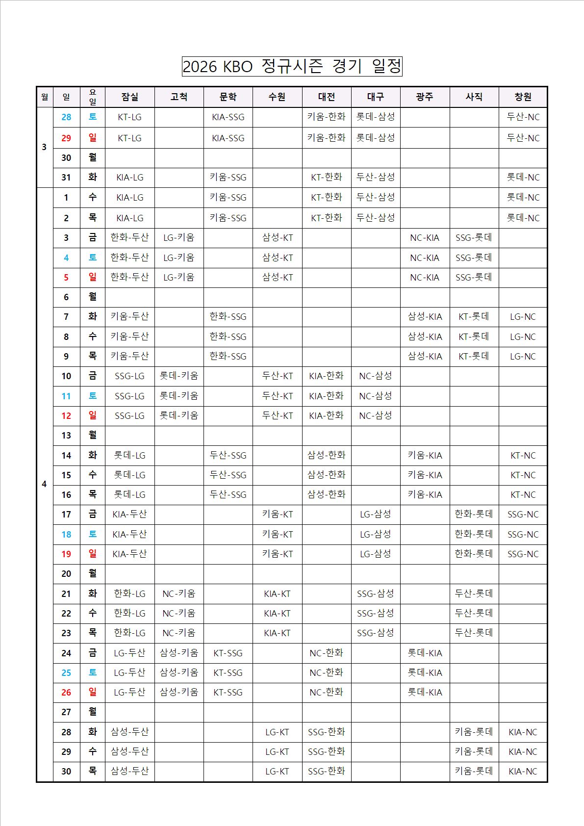 2026 프로야구 일정 | 홈개막전 | 대진표 | 시즌 일정표
