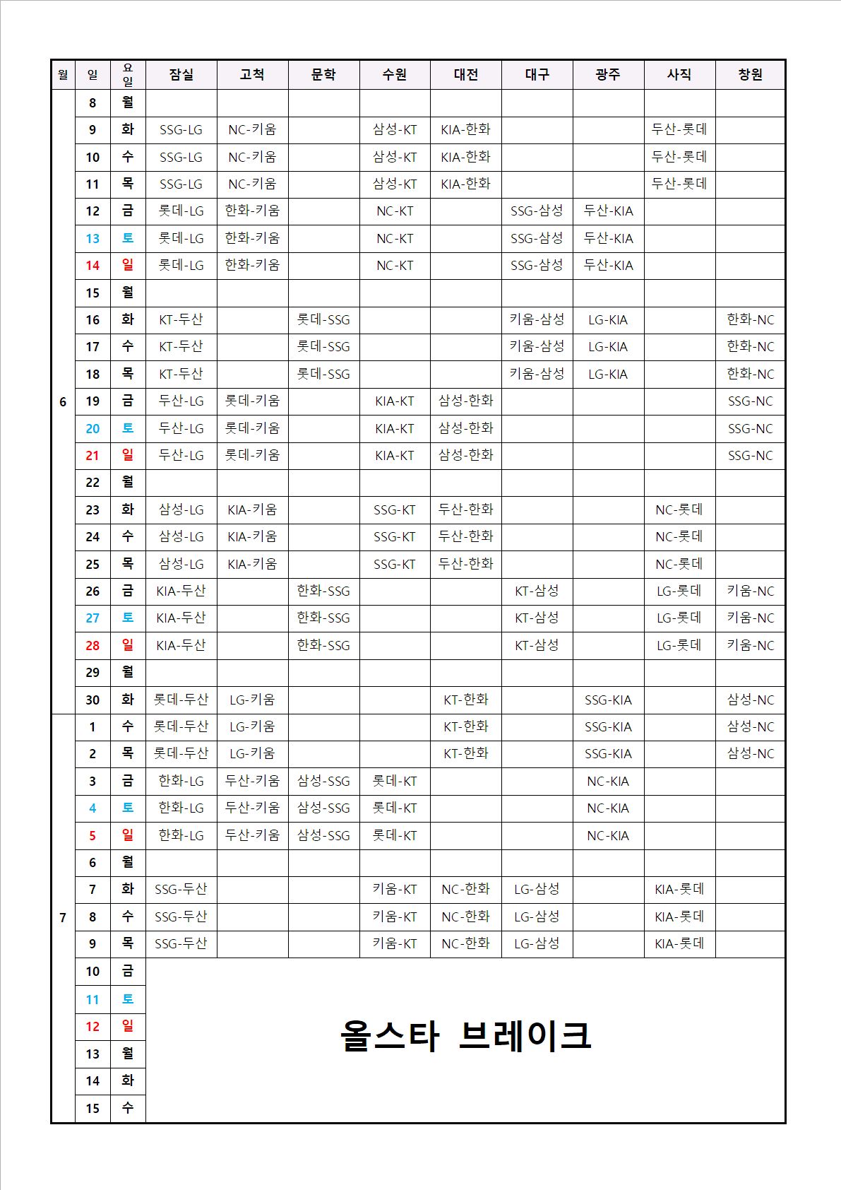 올스타전 직후인 7월 16일부터 정규시즌 후반기가 시작되며, 이 시점에는 4연전 일정으로 시즌이 재개됩니다. 이는 후반기 초반 일정 밀도를 조절하고, 시즌 후반 경쟁 구도를 빠르게 형성하기 위한 구조입니다.