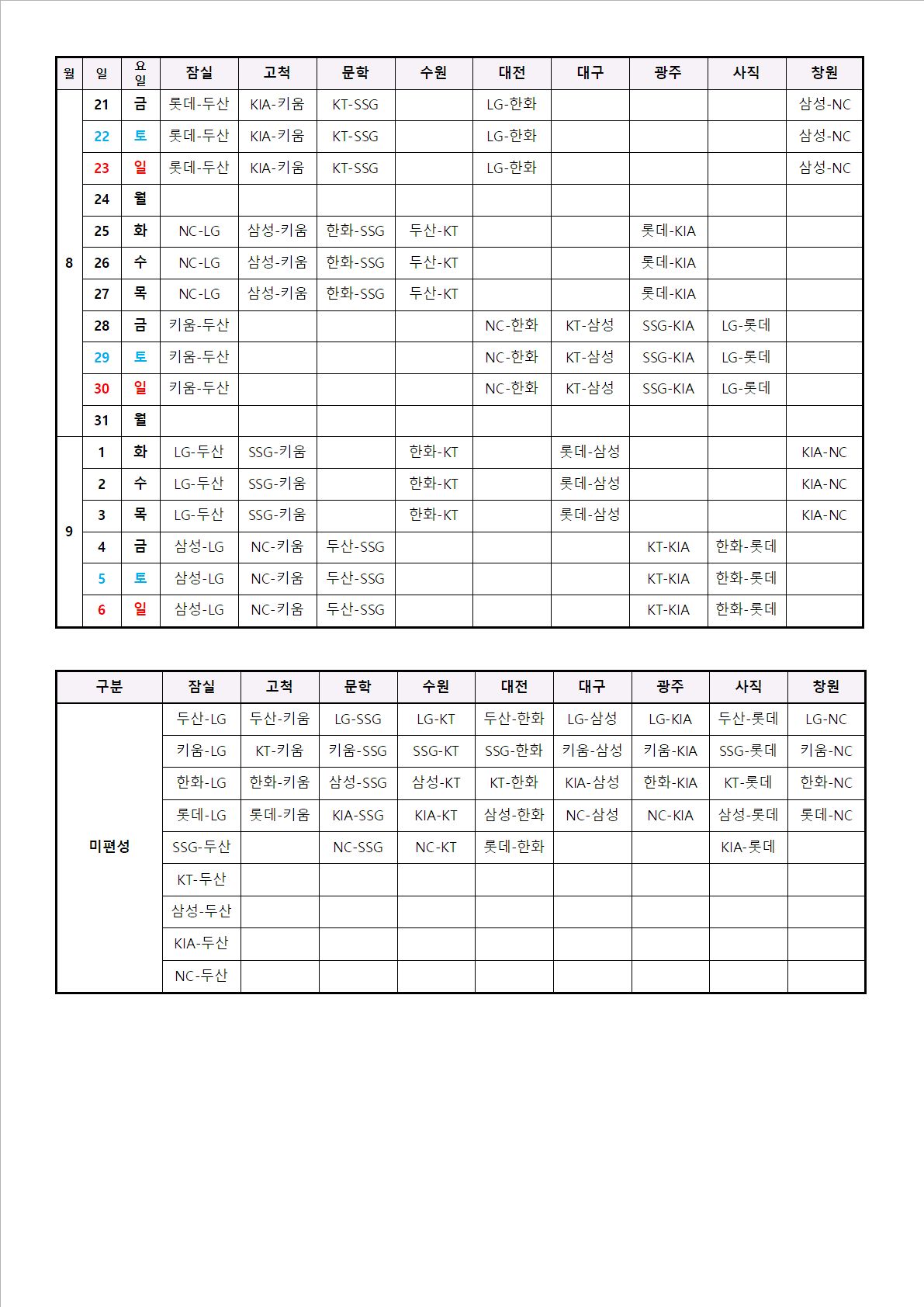 9월 6일까지 팀당 135경기가 우선 편성됐고, 이후 우천 취소 등으로 발생하는 미편성 경기와 함께 남은 45경기, 즉 팀당 9경기는 시즌 진행 상황에 따라 순차적으로 추가 편성됩니다. 이는 최근 기상 여건과 일정 변동 가능성을 고려한 현실적인 방식으로 평가됩니다.